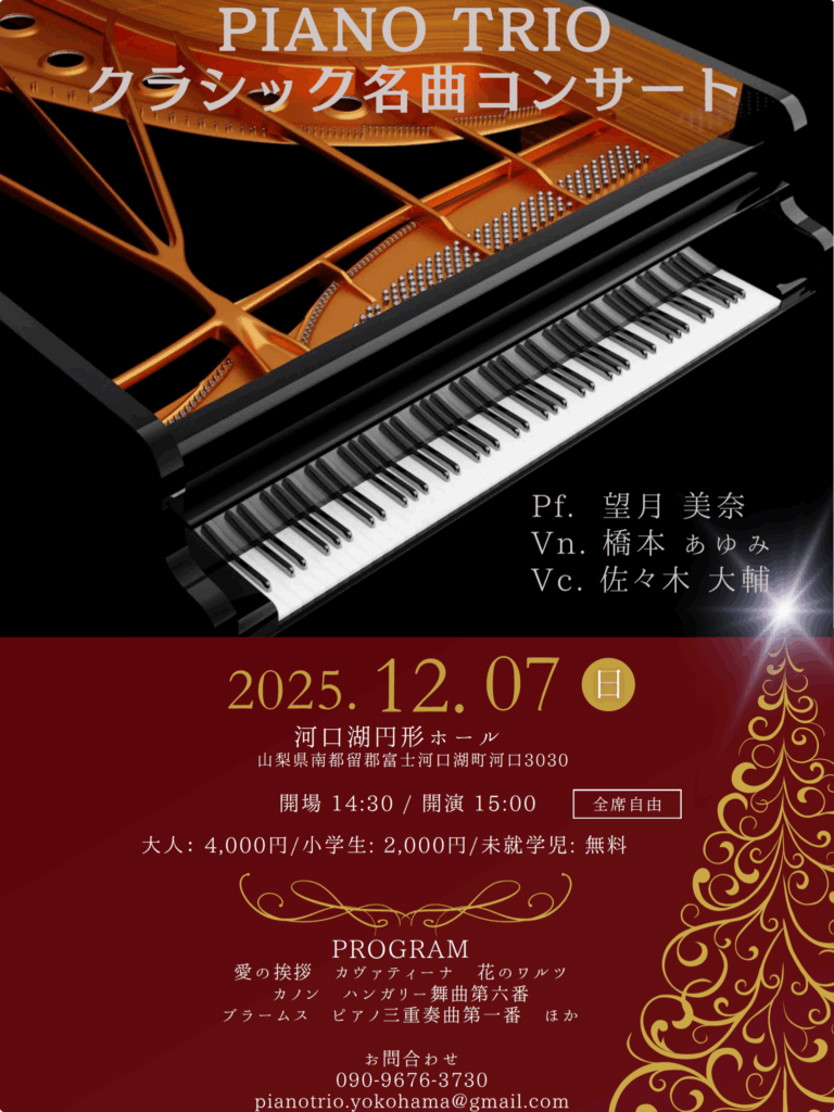 2025.11.8 & 12.7 ピアノトリオ クラシック名曲コンサート 2025 11/07 お知らせ コンサート ピアノ 望月美奈 ヴァイオリン 橋本あゆみ チェロ 佐々木大輔 11月に日野で、12月に河口湖で、ピアノトリオの演奏会を開催。 木々が色づく季節、心に響く音楽をお届けします。詳細はチラシをご覧ください。皆さまのご来場を心よりお待ちしております。 お知らせ コンサート よかったらシェアしてね! URLをコピーしました! URLをコピーしました! 最近のピアチェーノ この記事を書いた人 パパス 関連記事 最近のピアチェーノ 2025.9.15(月祝)ピアノ5重奏「ジブリコンサート」 2025.8.24室内楽演奏会[動画の配信あり] 2025年7月5日 第7回チェロオーケストラ演奏会 2025.4.3 こんにちはクラシックVol.15 2025.3.8佐々木大輔&原田翔デュオコンサート 2024.11.10ピアチェーノ音楽教室 第14回 発表会 サラサーテ掲載のお知らせ コメント コメントする コメントをキャンセルコメント ※ 名前 ※ メール ※ サイト 次回のコメントで使用するためブラウザーに自分の名前、メールアドレス、サイトを保存する。 Δ