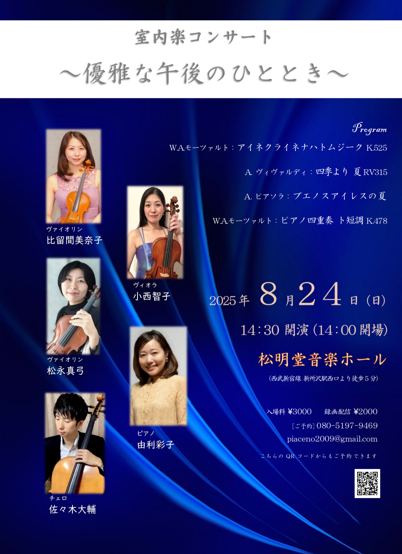 2025.6.3 14:30開演 (14:00開場) ヴァイオリン 比留間美奈子 ヴァイオリン 松永真弓 ヴィオラ 小西智子 チェロ 佐々木大輔 ピアノ 由利彩子 会場:松明堂音楽ホール チケットもしくは配信動画のお申…